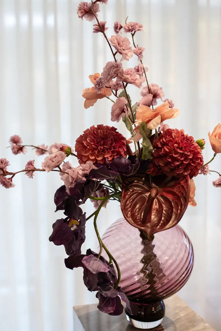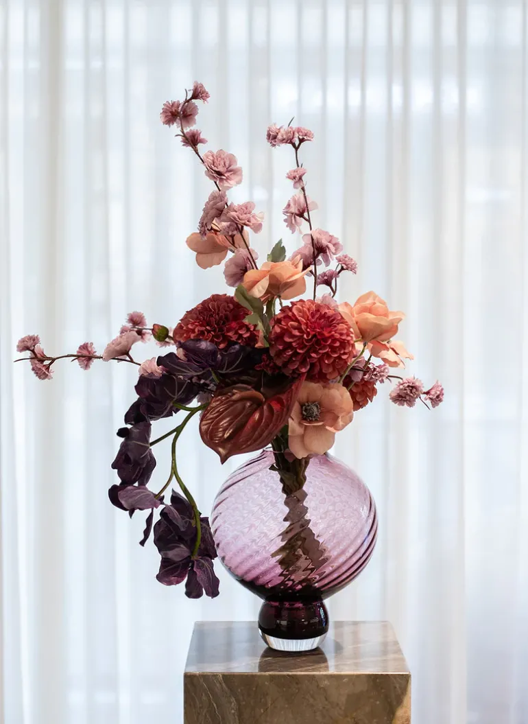 Buketten er stylet i den mundblæste Meadow swirl vase i medium.