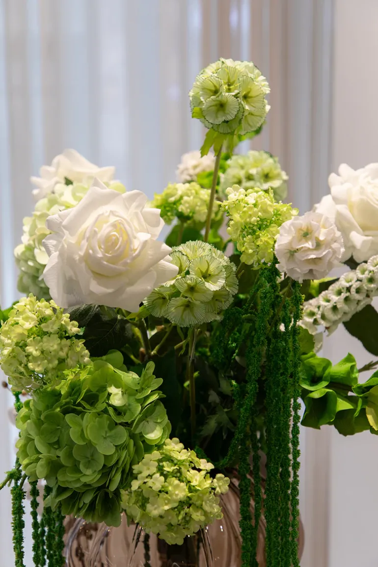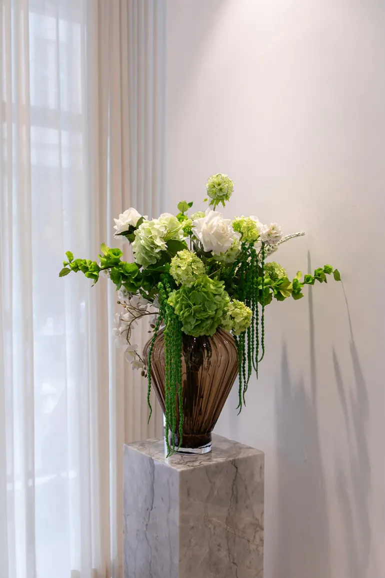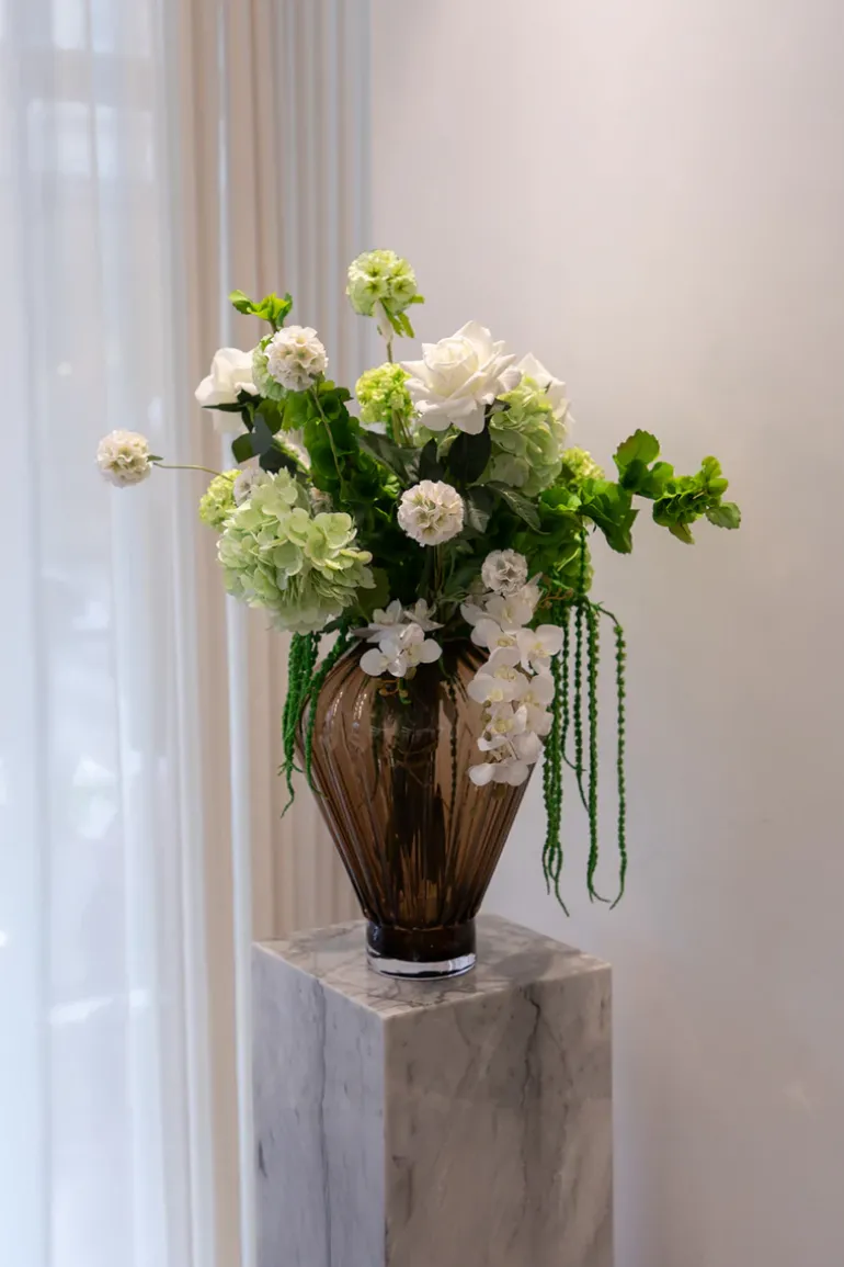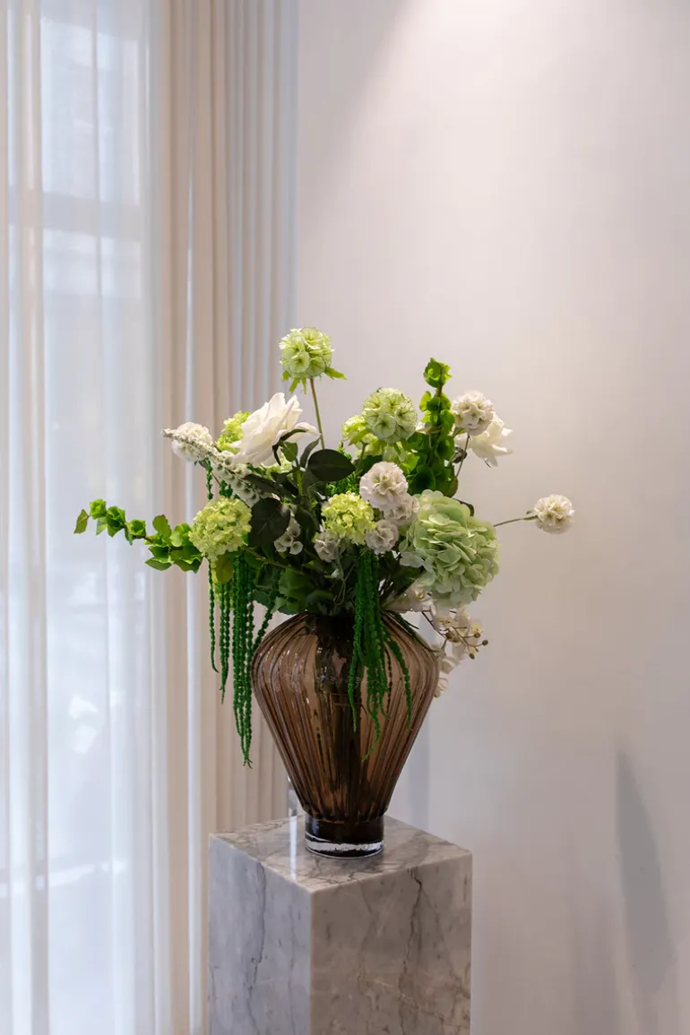 Buketten er stylet i Evelyn vasen i large i farven Topaz