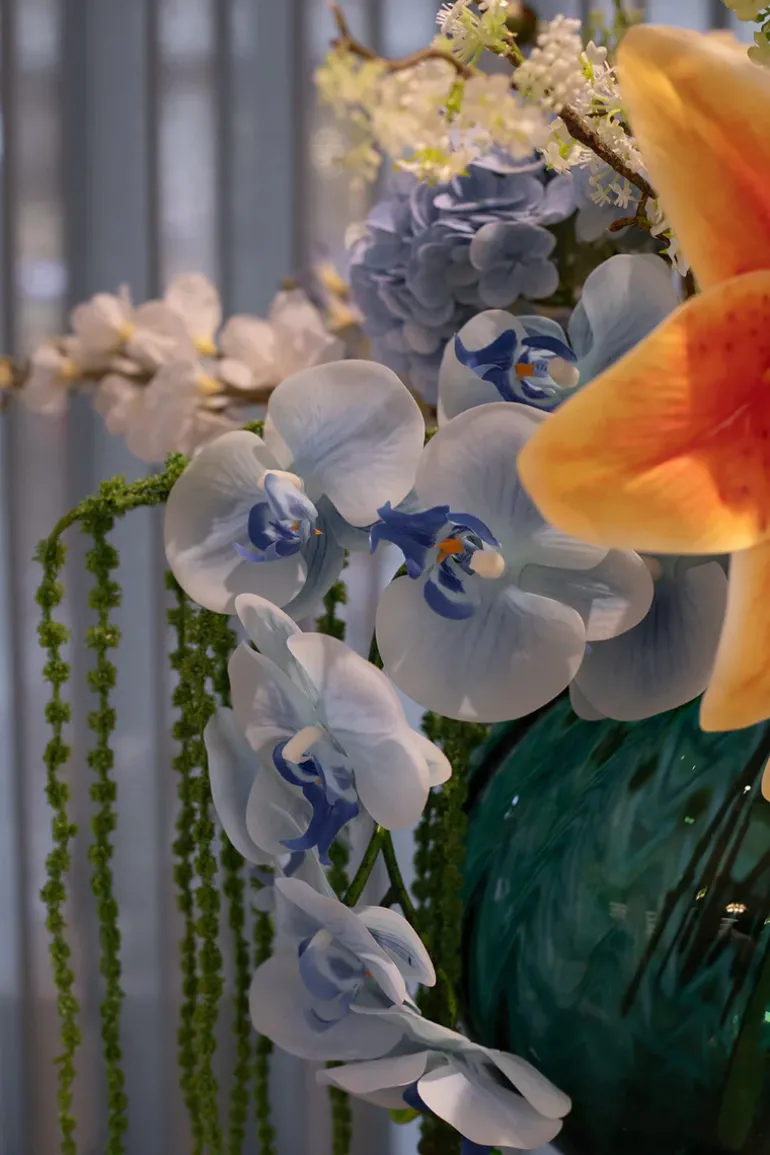 Forny dit hjem med vores eksklusive kunstneriske blomsterbuket. Med sin enestående kvalitet, naturtro udseende og smukke kombination af blomster, vil den tilføje en farverig touch til indretning.