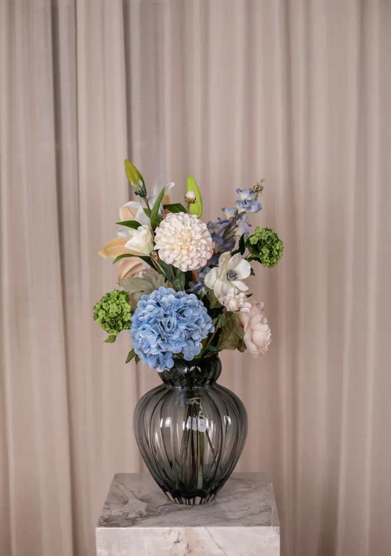 Buketten er stylet i Audrey vasen i large i farven petrol blue.