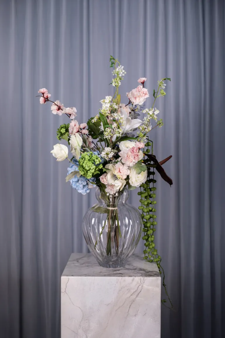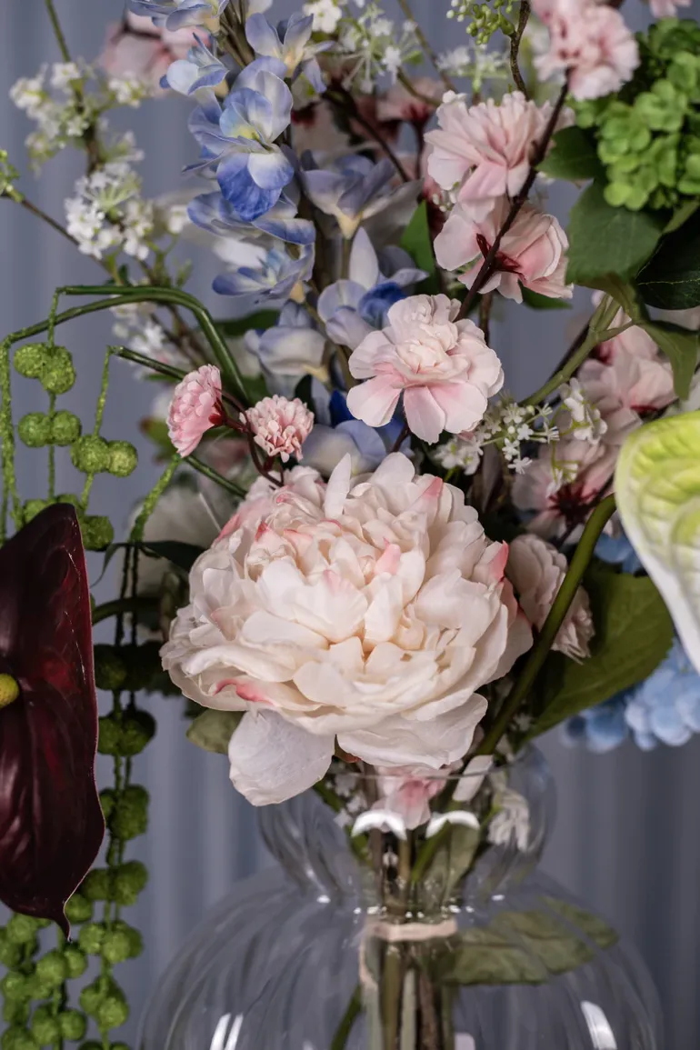 Forny dit hjem med vores eksklusive kunstneriske blomsterbuket. Med sin enestående kvalitet, naturtro udseende og smukke kombination af blomster, vil den tilføje en farverig touch til din indretning.
