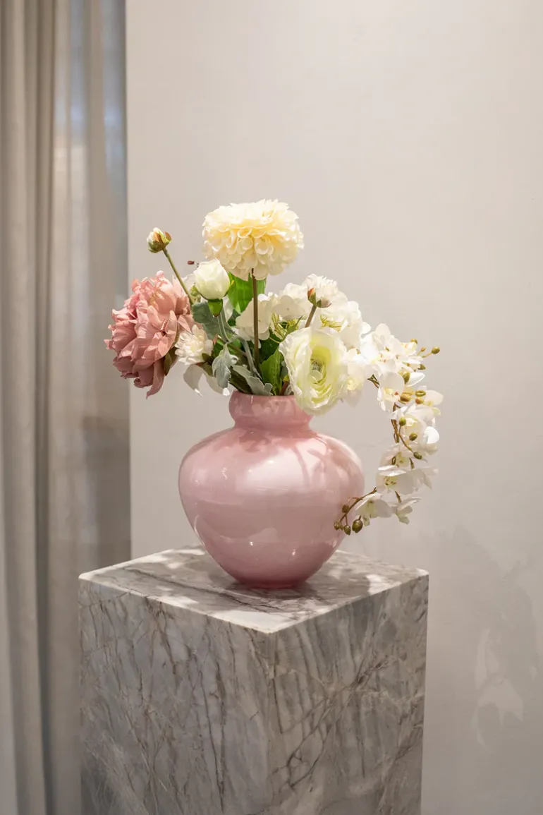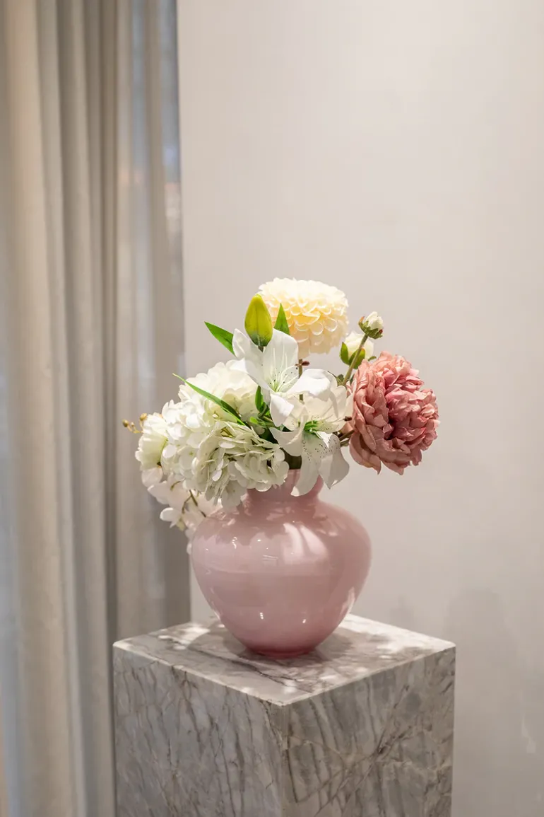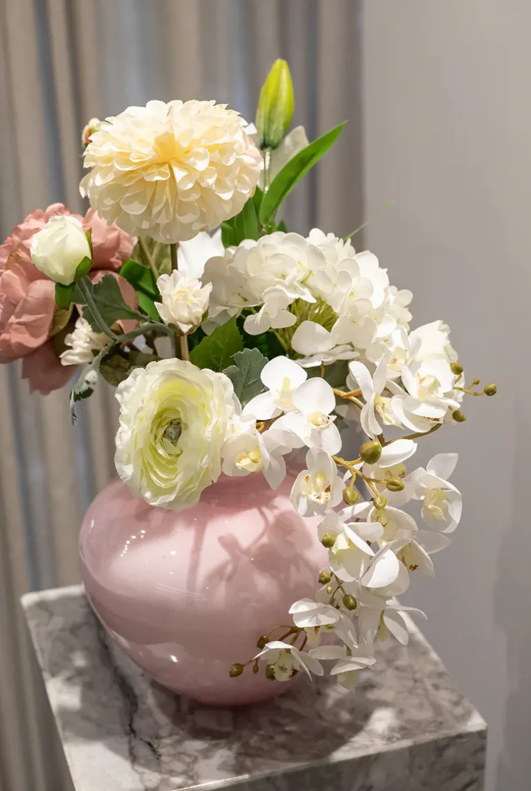 Forny dit hjem med vores eksklusive kunstneriske blomsterbuket. Med sin enestående kvalitet, naturtro udseende og smukke kombination af blomster, vil den tilføje en farverig touch til indretning.