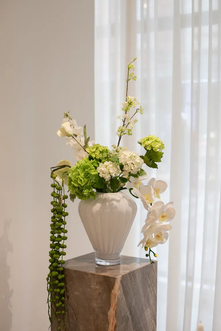 Buketten er stylet med den mundblæste Evelyn vase i medium størrelsen.