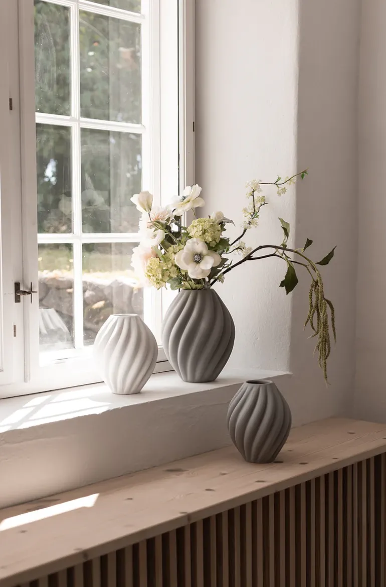 Vasen findes i 4 naturlige farver og 2 størrelser, og er med sine bølgende linjer og strukturelle, rå sand-inspireret overflade en smuk tilføjelse til indretningen.