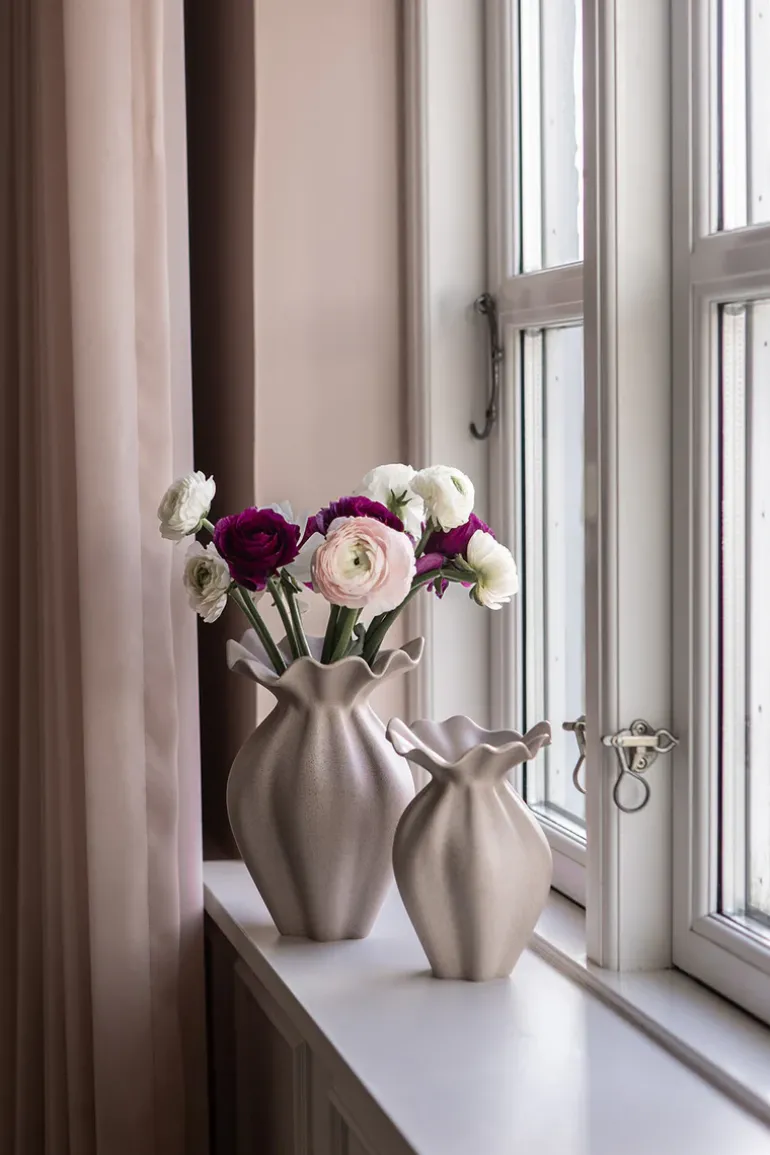 Nellie vasen er skabt i samme ånd som Nellie kanden. Denne håndlavede vase, lavet af keramik, er et kunstværk i sig selv. Den glatte overflade og bølgende linjer giver vasen et elegant og moderne udtryk. Inspireret af naturens skønhed er vasens åbning formet organisk.