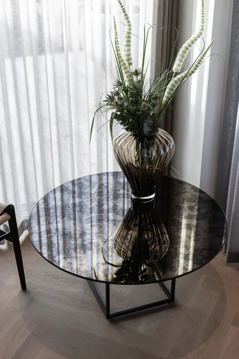 Det stilrene sorte stel, som skaber en smuk kontrast til den unikke spejlplade, forener det klassiske med det moderne.