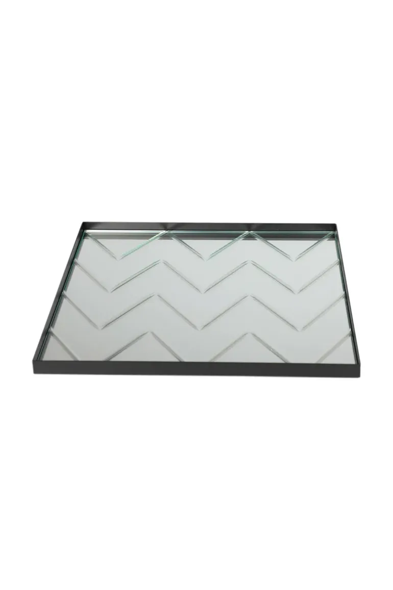 Herringbone bakken er designet til at være en eksklusiv og dekorativ tilføjelse til indretning, som kan anvendes i alle husets rum. Det facetslebne spejl, som er inspireret af det klassiske sildebensmønster, og den sorte metalramme forener det moderne med det klassiske.