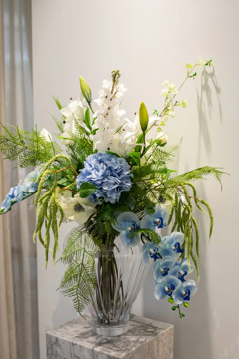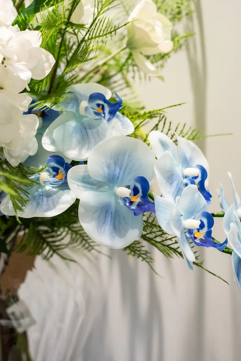 Forny dit hjem med vores eksklusive kunstneriske blomsterbuket. Med sin enestående kvalitet, naturtro udseende og smukke kombination af blomster, vil den tilføje en farverig touch til din indretning.