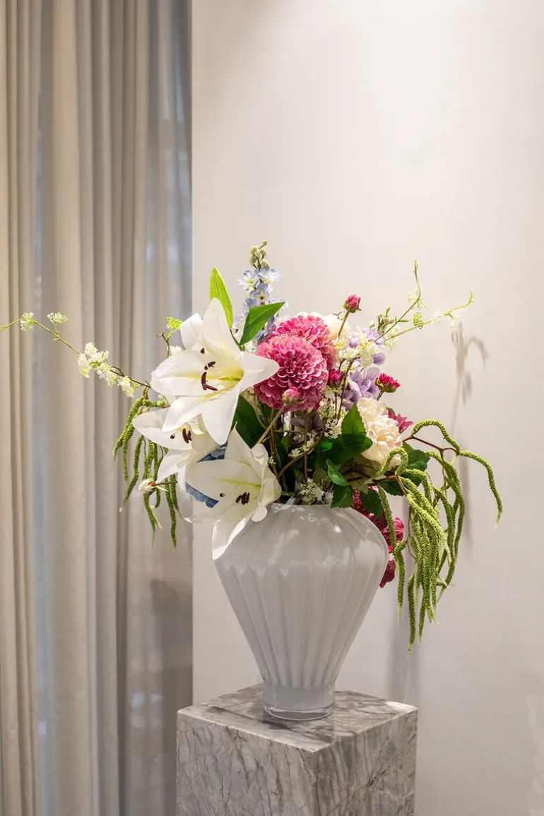 Buketten er stylet i Evelyn vase i farven opal i large.
