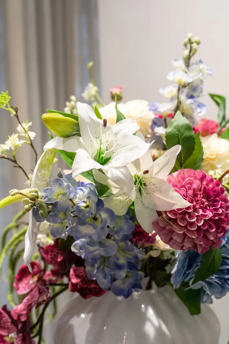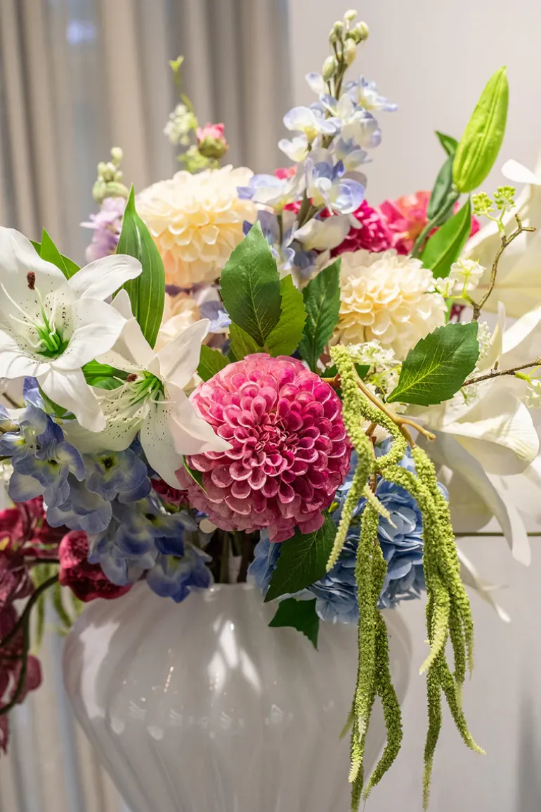 Forny dit hjem med vores eksklusive kunstneriske blomsterbuket. Med sin enestående kvalitet, naturtro udseende og smukke kombination af blomster, vil den tilføje en farverig touch til indretning.