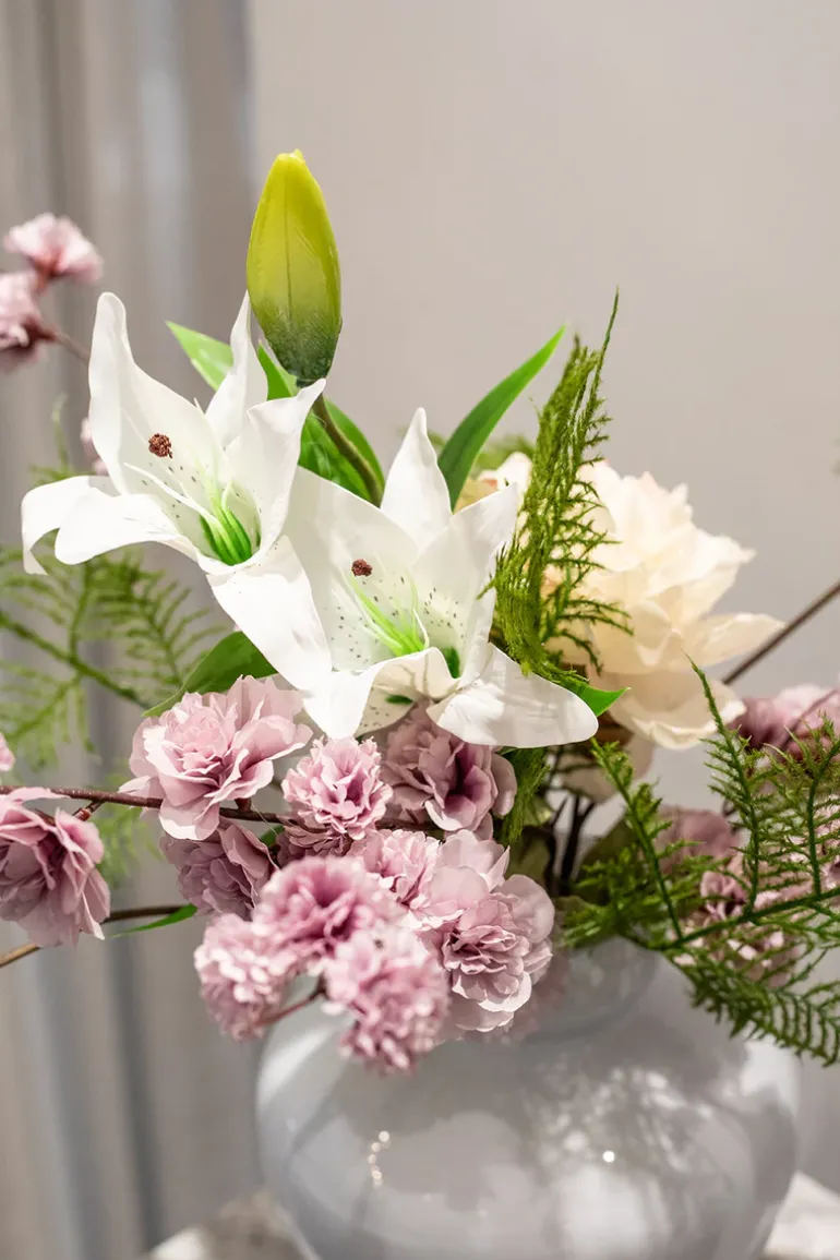Forny dit hjem med vores eksklusive kunstneriske blomsterbuket. Med sin enestående kvalitet, naturtro udseende og smukke kombination af blomster, vil den tilføje en farverig touch til indretning.